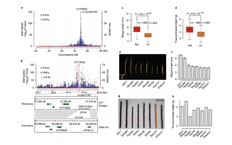 (2)在除水稻以外的作物中也有使用SVs進(jìn)行GWAS的報(bào)道。例如,在玉米中,521個(gè)自交系玉米基因組序列中的SVs被用于繪制玉米SV圖譜;在小麥中發(fā)現(xiàn)了影響染色體3B上基因和轉(zhuǎn)座元件的SV;在最近的一項(xiàng)木瓜研究中(使用栽培木瓜和野生木瓜),共鑒定出8083個(gè)SVs,其中包括5260個(gè)缺失,552個(gè)串聯(lián)重復(fù)和2271個(gè)插入,在該研究中,還發(fā)現(xiàn)CNVs與生長(zhǎng)和對(duì)環(huán)境壓力的反應(yīng)有關(guān);在油菜中,基于鑒定得到的數(shù)百萬(wàn)SVs和PAVs用于PAV-GWAS,直接鑒定到了莢果長(zhǎng)度、種子重量和開(kāi)花時(shí)間相關(guān)的結(jié)構(gòu)變異,這些是之前基于單核苷酸變異SNP進(jìn)行的GWAS所沒(méi)能鑒定出來(lái)的,充分說(shuō)明了PAV-GWAS可以互補(bǔ)于SNP-GWAS用來(lái)鑒定特定性狀相關(guān)的位點(diǎn)(圖7);另外,其他植物SVs鑒定例子包括:溝酸漿屬的耐鹽性、葡萄的漿果顏色和番茄的馴化性狀等研究。
