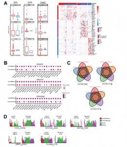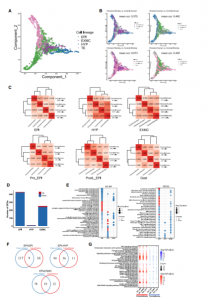 首先基于所有細(xì)胞的轉(zhuǎn)錄組學(xué)特性構(gòu)建了一個導(dǎo)向圖(SPRING),所有細(xì)胞分為三個分支:EPI、HYP和TE(圖 2A),明確了嵌合體和對照(人和食蟹猴)胚胎之間基因表達(dá)模式的相關(guān)性(圖 2B)。當(dāng)嵌合人類細(xì)胞與對照人類(0.460)或?qū)φ帐承泛铮?.459)細(xì)胞進(jìn)行比較時,獲得了類似的相關(guān)系數(shù)(圖 2B,右圖),但與對照胚胎相比,嵌合猴細(xì)胞的相關(guān)系數(shù)高于嵌合人類細(xì)胞(圖 2B,左圖);接下來發(fā)現(xiàn)嵌合人EPI-like細(xì)胞與人胚胎中的EPI細(xì)胞相似,而嵌合人HYP和EXMC-like細(xì)胞分別與嵌合猴HYP和EXMCs細(xì)胞相關(guān)系數(shù)最高(圖 2C)。同時發(fā)現(xiàn)嵌合人類EPI-like細(xì)胞逐漸傾向于嵌合猴EPI細(xì)胞,R2值從0.363(植入前EPI [Pre_EPI])增加到0.464(植入后EPI [PostL_EPI]),再增加到0.693(原腸[Gast]細(xì)胞)(圖 2C)。以上結(jié)果表明猴胚胎微環(huán)境對人類細(xì)胞的基因轉(zhuǎn)錄狀態(tài)產(chǎn)生影響,反之亦然。