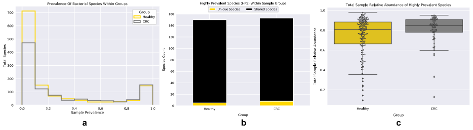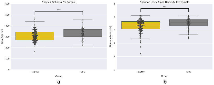 使用基于em的方法計算每個樣本內(nèi)物種的相對豐度,以構(gòu)建一個樣本分類單元矩陣,通過測量每個樣本的細菌豐富度和Shannon指數(shù),利用該矩陣探究兩個樣本組(健康和晚期CRC)的微生物多樣性。CRC組的樣本顯示出更大的多樣性,包括豐富度和Shannon指數(shù)(Mann-Whitney U檢驗:MWU);豐富度:MWU pvalue = 0.0005, Shannon指數(shù):MWU pvalue = 0.0009)(圖一a,b)。由于物種多樣性的量度對物種均勻度和豐富度的敏感性不同,還應用了辛普森指數(shù)來計算樣本組內(nèi)的物種多樣性,這些結(jié)果與之前的分析一致,CRC樣本中的物種多樣性與健康樣本中的物種多樣性有顯著性差異(MWU值= 0.0238).