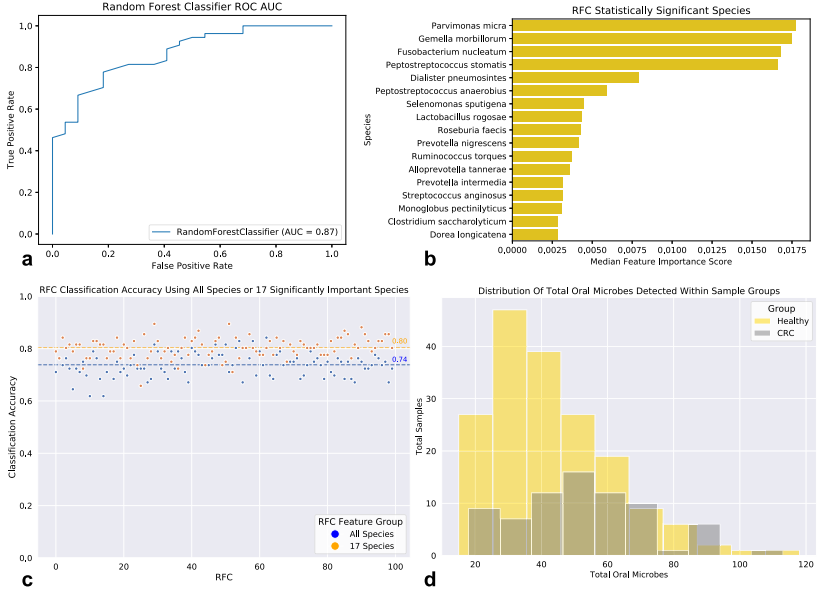 評估健康和晚期結(jié)直腸癌相關(guān)腸道微生物群之間的細菌群落分類特征差異。對樣本分類群矩陣進行CLR轉(zhuǎn)換,使用主成分分析進行基于分類剖面的樣本排序。前兩個主成分只能解釋總方差的一小部分(PC1: 7.98%,PC2: 5.61%),基于主成分分析的線性變換未顯示健康樣本與CRC樣本有差異,但通過隨機森林分類器(RFC)可以區(qū)分兩個樣本組(AUC = 0.87)(圖 2a)。雖然RFC根據(jù)重要性對物種進行排序,但這些默認度量是有一定偏差。為獲得RFC提供的物種重要度的統(tǒng)計顯著性,在我特征集中包含一個“隨機”特征。通過使用100個RFC的集合,發(fā)現(xiàn)了17種細菌,在這些顯著“重要”物種上訓練的100個RFC的準確性分類得分大于在所有物種上訓練的100個RFC的準確性分類得分(所有物種平均準確性為74%;17個非?!爸匾钡奈锓N平均準確率為80%(圖 2c)。物種差異豐度分析顯示,與健康腸道微生物組相比,CRC相關(guān)腸道微生物組中有174個物種的相對豐度顯著降低,10個物種的相對豐度顯著升高。這174個細菌物種分別來自84個屬,大多數(shù)來自 Enterobacter(6.8%), Klebsiella(6.3%), Streptococcus(5.2%), Lactobacillus (5.1%), Citrobacter(4.6%), Bifidobacterium(4%),Bacteroides(3.4%),以及 Clostridium(3.4%)。CRC中相對豐度顯著升高的10個物種是 Parvimonas micra(qvalue = 3.09e-09), Peptostreptococcus stomatis(qvalue = 4.51e-08), Gemella morbillorum(qvalue = 4.55e-08), Fusobacterium nucleatum(qvalue = 1.08e-06), Streptococcus anginosus(qvalue = 1.13e-03), Dialister pneumosintes (qvalue=1.37e-03),Peptostreptococcus anaerobius (qvalue=4.74e-03), Streptococcus sp. KCOM 2412(Streptococcus periodonticum)(qvalue = 7.18e-03), Ruminococcus torques(qvalue = 1.55e-02),以及ilifactor alocis(qvalue = 2.85e-02)。