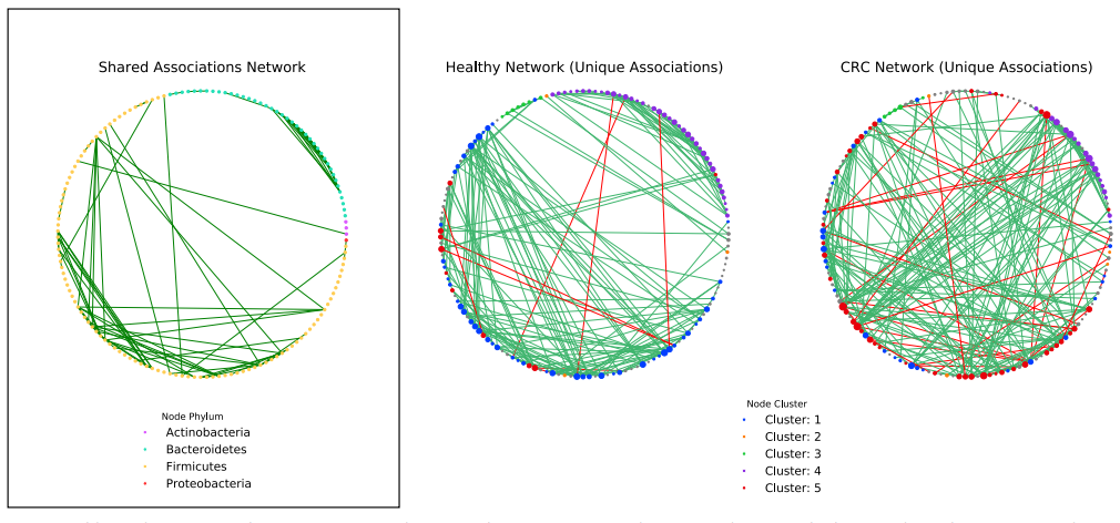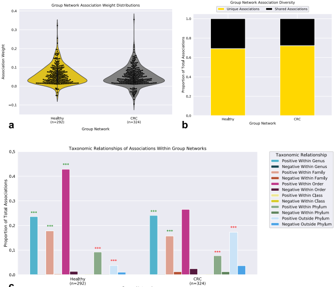 群體網(wǎng)絡包含相似的關(guān)聯(lián)權(quán)重分布,正相關(guān)比負相關(guān)更多(圖4a)。值得注意的是,與健康網(wǎng)絡相比,CRC包含更多的負相關(guān)。29%的負相關(guān)涉及一種被認為是口腔微生物的物種,而在健康網(wǎng)絡中,沒有發(fā)現(xiàn)涉及口腔菌群。在網(wǎng)絡中發(fā)現(xiàn)的大多數(shù)關(guān)聯(lián)是該網(wǎng)絡獨有的(健康:69%,CRC:72%)(圖4b)。我們假設群落結(jié)構(gòu)的這種巨大差異可以反映生態(tài)系統(tǒng)的變化,并進而分析了網(wǎng)絡中物種之間的分類關(guān)系(圖4c)。兩個網(wǎng)絡在同一屬內(nèi)的物種(健康:MCS pvalue= 0.00099,CRC:MCS pvalue= 0.00099)和家族(健康:MCS值= 0.00099,CRC:MCS= 0.00099 )。然而,只有在健康組的網(wǎng)絡中,物種與來自同一順序的其他物種的積極相關(guān)仍然明顯多于隨機相關(guān)(健康:MCS pvalue= 0.00099,CRC: MCS pvalue = 0.44)。與健康網(wǎng)絡(健康:4%,CRC:17%)相比,CRC的網(wǎng)絡在分類上的遠緣關(guān)系中顯示出更大的豐度,在健康網(wǎng)絡中分類上的遠緣微生物之間的正關(guān)聯(lián)仍然顯著較少(門內(nèi):MCS值= 0.00099,門外:MCSp值= 0.00099)和CRC(門內(nèi):MCS pvalue= 0.00099,門外:MCS pvalue= 0.00099)而不是隨機網(wǎng)絡。