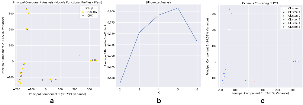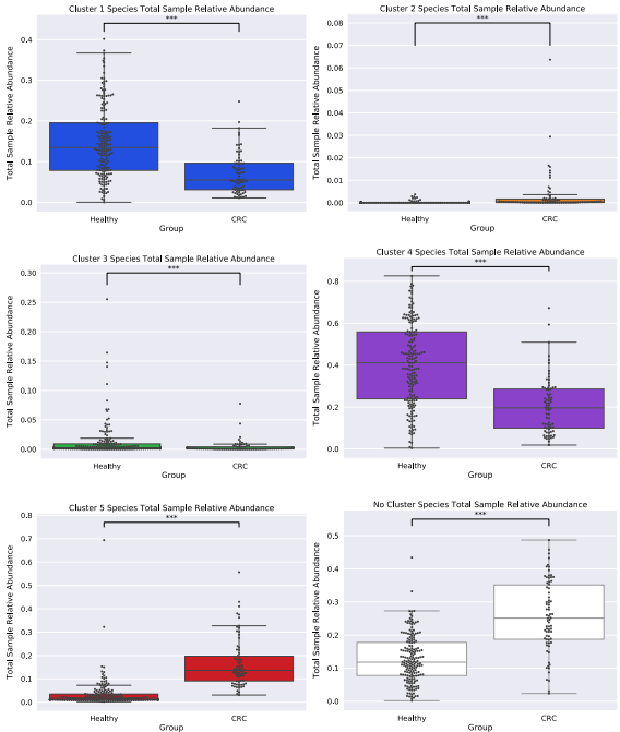 通過構(gòu)建CLR轉(zhuǎn)換的模塊功能來比較模塊的潛在功能。模塊功能(蛋白域)圖譜的PCA顯示出較大的差異(PC1: 33.73%,PC2: 14.53%),模塊似乎形成包含兩組代表的簇團(圖 5a)。為了定義模塊的聚類,進行了輪廓分析,估計五個聚類作為用于K-均值聚類的最*K值(圖?5b)。通過K-均值聚類定義模塊聚類后(圖?5c)對這些集群進行了分類分析。在整個網(wǎng)絡中,同一集群內(nèi)的模塊被發(fā)現(xiàn)在分類學上是相似的,不包括簇1和簇5,簇1和簇5顯示出物種占有的變化,其中在健康網(wǎng)絡的簇1內(nèi)發(fā)現(xiàn)的一些物種被顯示在CRC組的簇5內(nèi)。然而,兩個網(wǎng)絡對在簇2、3和4中發(fā)現(xiàn)的物種有很強的一致性。第2組中的物種僅有“致病菌”(即通常無害但在特定環(huán)境條件下具有致病能力的物種)口腔微生物,而簇3主要是鏈球菌種和簇4主要類桿菌種。隨后,進行聚類功能分析以發(fā)現(xiàn)蛋白質(zhì)結(jié)構(gòu)域,以及蛋白質(zhì)家族的主要作用和次要作用,這使得聚類在功能上不同。簇1的功能與細胞表面粘附、對抗沖突策略、酪氨酸重組酶、多糖降解、糖胺聚糖結(jié)合、腫瘤蛋白酶抑制、過氧化物酶功能、碳水化合物/纖維素結(jié)合活性和氨基酸生物合成相關(guān)。簇2的功能涉及對宿主細胞和細胞外基質(zhì)的粘附、細胞感染、膠原結(jié)合、補體抗性、鳥氨酸/賴氨酸/精氨酸脫羧酶(組織腐敗/多胺合成/酸性環(huán)境抗性)、金屬肽酶、V型分泌系統(tǒng)、氨的產(chǎn)生和有毒金屬離子的排泄(銅流出系統(tǒng))、細胞包膜、DNA代謝、脂肪酸和磷脂代謝、表面多糖和脂多糖的生物合成和降解。簇3的功能與粘蛋白結(jié)合、鋅清除/吸收、細胞表面粘附、葡萄糖結(jié)合/轉(zhuǎn)運和銅結(jié)合、蛋白質(zhì)和肽的命運/合成/分泌、多糖/碳水化合物、有機醇和酸的降解方面有關(guān)。簇4的功能涉及金屬結(jié)合、二瓜氨酸環(huán)化酶/磷酸二酯酶、群體感應、碳水化合物結(jié)合和半胱氨酸/木瓜蛋白酶、核苷和核苷酸、轉(zhuǎn)運和結(jié)合蛋白、TCA循環(huán)、鐵攜帶以及表面多糖的降解和生物合成。最后簇5的區(qū)別功能與氨肽酶、三羧酸受體、乙醇胺轉(zhuǎn)運、淀粉利用、木葡聚糖/多糖結(jié)合、能量代謝、氨基酸和胺、陽離子和鐵化合物、電子轉(zhuǎn)運以及表面多糖和脂多糖的生物合成和降解相關(guān)。檢查了在每個集群內(nèi)發(fā)現(xiàn)的用于網(wǎng)絡構(gòu)建的物種的豐度(健康:簇1 (33%)、簇2 (2%)、簇3 (5%)、簇4 (26%)、簇5 (7%)、無(27%);CRC:簇1 (19%)、簇2 (3%)、簇3 (3%)、簇4 (12%)、簇5 (30%)、無(33%)(圖6)。我們的發(fā)現(xiàn)表明,與健康組相比,在CRC中,第2類和第5類組模塊中發(fā)現(xiàn)的物種總數(shù)增加,第1類、第3類和第4類組中發(fā)現(xiàn)的物種減少。這些結(jié)果也反映在我們發(fā)現(xiàn)的總樣本相對豐度的統(tǒng)計顯著變化中,即群內(nèi)物種在群間所占的比例(第一組: MWU值= 4.29 e-12;第二組:MWU值= 3.16 e-16;第三組:MWU值= 0.0002;第四組:MWU值= 2.62-13;第五組:MWUp值= 2.81 e-29;無集群物種:MWU值= 4.40-17(圖7)。此外,發(fā)現(xiàn)網(wǎng)絡內(nèi)的大多數(shù)負面關(guān)聯(lián)(健康:100%,CRC:96%)發(fā)生在占據(jù)不同集群類型內(nèi)模塊的物種之間。只有在CRC中,簇1的物種之間才出現(xiàn)集群內(nèi)的負相關(guān),其中物種種類和豐度也顯示出減少。