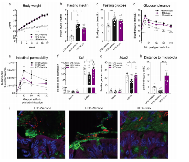 該文章首先研究了溶菌酶對(duì)飲食誘導(dǎo)型肥胖小鼠的潛在影響。研究結(jié)果發(fā)現(xiàn),與喂食LFD的小鼠相比,喂食HFD的小鼠體重增加了更多,每天補(bǔ)充溶菌酶對(duì)身體成分或能量攝入沒有產(chǎn)生可測(cè)量的影響(圖1a),然而,接受溶菌酶治療的小鼠確實(shí)表現(xiàn)出了更低的空腹胰島素水平(圖1b)。與Vehicle+HFD組相比,溶菌酶更傾向于降低餐后血糖而不是空腹血糖。葡萄糖刺激的胰島素濃度不受溶菌酶補(bǔ)充的影響。與已知可以調(diào)節(jié)腸道滲漏的空腹胰島素減少類似,本文研究者們?cè)谌芫腹辔傅膭?dòng)物中觀察到HFD誘導(dǎo)的腸道通透性出現(xiàn)數(shù)值保護(hù)(圖1e)。這些體內(nèi)跡象表明HFD喂養(yǎng)的小鼠腸道通透性增加,且循環(huán)LPS、腸炎癥以及與結(jié)腸和回腸緊密連接基因的表達(dá)在組間保持相似。盡管如此,溶菌酶還是使HFD誘導(dǎo)的結(jié)腸中Tlr2表達(dá)的減少維持在正常范圍內(nèi)(圖1f)。根據(jù)已有研究顯示,TLR2的激活與結(jié)腸杯狀細(xì)胞的黏液調(diào)節(jié)有關(guān),因此本文研究者們調(diào)查了黏液的產(chǎn)生,發(fā)現(xiàn)補(bǔ)充溶菌酶可防止HFD誘導(dǎo)的結(jié)腸Muc2下調(diào)(圖1g)。進(jìn)一步的,發(fā)現(xiàn)這種溶菌酶介導(dǎo)的黏液完整性保存,可能是由于腸上皮細(xì)胞到最近細(xì)菌的平均距離增加6倍以上導(dǎo)致,從而說明補(bǔ)充溶菌酶足以防止HFD引起的微生物區(qū)系侵蝕(圖1h-i)。