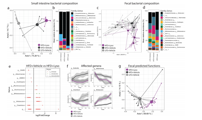 由于微生物區(qū)系侵蝕的減少也可能由于溶菌酶具有潛在的殺菌活性,因此本文研究者接下來評(píng)估了實(shí)驗(yàn)小鼠糞便微生物群的縱向變化。在研究開始時(shí),所有的小鼠都低脂喂養(yǎng),且微生物組成分析顯示這些小鼠的微生物組成具有相似性。HFD喂養(yǎng)導(dǎo)致了小腸和糞便樣本中的微生物群組成產(chǎn)生了巨大差異(圖2a-d)??v向抽樣顯示,飲食干預(yù)導(dǎo)致糞便微生物群發(fā)生即時(shí)變化,而溶菌酶給藥的影響逐漸顯現(xiàn)。與其他組相比,每天接受口服溶菌酶的小鼠,其微生物群落在結(jié)構(gòu)上表現(xiàn)出獨(dú)特和漸進(jìn)的軌跡(圖2c)。但盡管如此,除在小腸中,一些HFD誘導(dǎo)的糞便微生物變化可以通過補(bǔ)充溶菌酶來抵抗(圖2a-f)。微生物群的alpha多樣性不受溶菌酶給藥的影響,說明該溶菌酶沒有相應(yīng)明顯的抗菌作用。與vehicle組小鼠相比,接受溶菌酶的小鼠糞便中大量細(xì)菌ASVs的相對(duì)豐度被修飾了,且受調(diào)控的ASVs大多屬于厚壁菌門,其中Akkermansia muciniphila和Oscillospira(顫螺菌屬)減少,胃瘤胃球菌屬的一種未分類的胃瘤胃球菌、假長雙歧桿菌和異歧桿菌的相對(duì)豐度則增加(圖2e)。此外,由于補(bǔ)充了溶菌酶,4個(gè)細(xì)菌屬顯示在整個(gè)屬水平都發(fā)生了ASVs豐度改變(圖2f),而其它的ASV修飾則呈現(xiàn)出物種依賴性。接下來,本文研究者們對(duì)細(xì)菌群落進(jìn)行了功能預(yù)測(cè),結(jié)果顯示接受溶菌酶的小鼠糞便樣本菌群預(yù)測(cè)功能發(fā)生了顯著變化,而小腸樣本中則沒有顯著變化(圖2g和圖3f)。