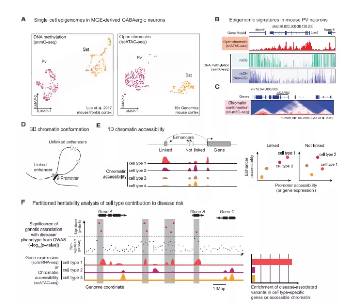 盡管全基因組關(guān)聯(lián)研究(GWASs)已經(jīng)確定了一些神經(jīng)和精神疾病的風(fēng)險(xiǎn)位點(diǎn),但每種疾病中特定腦細(xì)胞類(lèi)型的脆弱性在很大程度上仍是未知的。通過(guò)細(xì)胞類(lèi)型特異性轉(zhuǎn)錄組或表觀基因組的遺傳分析可以識(shí)別活躍基因在GWAS風(fēng)險(xiǎn)位點(diǎn)附近富集的細(xì)胞類(lèi)型,表明其在疾病中可能具有直接或間接的作用(圖3F)。