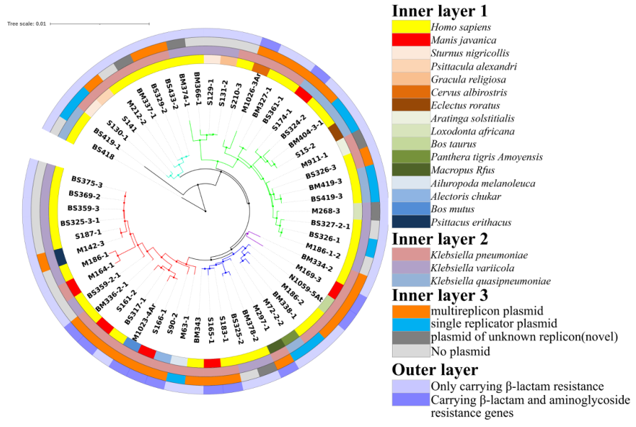 多復(fù)制子耐藥質(zhì)粒已成為革蘭氏陰性菌耐藥基因的重要載體,但多復(fù)制子質(zhì)粒的進(jìn)化尚不清楚。該研究采用微量肉湯稀釋法對2018年至2020年從不同野生動物和環(huán)境中分離到的56株克雷伯氏菌進(jìn)行了表型鑒定,并對其進(jìn)行了測序和分析,以進(jìn)行細(xì)菌全基因組關(guān)聯(lián)研究。結(jié)果表明,非人類來源的菌株對氨芐西林的耐藥率較高(80.36%),且耐藥范圍較廣。馬來亞穿山甲分離株對頭孢類抗生素高度耐受,同時(shí)對氯霉素、左氧氟沙星和復(fù)方新諾明等藥物耐受?;蚪M分析表明,這些菌株的抗性質(zhì)粒攜帶多種抗生素耐藥基因。進(jìn)一步對69個(gè)質(zhì)粒序列分析表明,28個(gè)質(zhì)粒為多復(fù)制子質(zhì)粒,主要攜帶blaCTX-M-15、blaCTX-M-14、blaCTX-M-55、blaOXA-1和blaTEM-1等β-內(nèi)酰胺酶基因。對不同分離株攜帶的質(zhì)粒分析表明,Klebsiella pneumoniae可能是一種重要的多復(fù)制子質(zhì)粒宿主。質(zhì)粒骨架和結(jié)構(gòu)分析表明,多拷貝質(zhì)粒是由兩個(gè)或兩個(gè)以上的單個(gè)質(zhì)粒融合而成,對抗生素環(huán)境具有很強(qiáng)的適應(yīng)性,不斷增強(qiáng)耐藥菌株在世界范圍內(nèi)傳播的能力。綜上所述,多復(fù)制子質(zhì)粒比非復(fù)制子質(zhì)粒能夠更好地?cái)y帶抗性基因,這可能是細(xì)菌對高抗生素壓力環(huán)境反應(yīng)的重要機(jī)制。該研究對于未來探索細(xì)菌抗性基因的傳播擴(kuò)散機(jī)制具有重要意義。