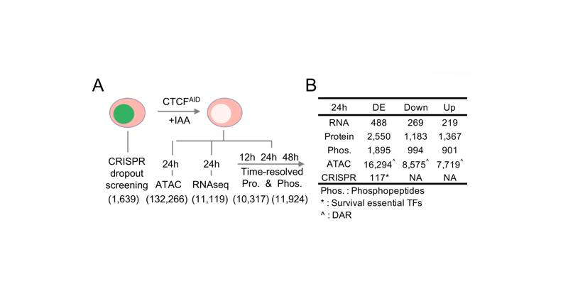 CCCTC-結(jié)合因子(CTCF)是一種高度保守的含鋅指轉(zhuǎn)錄因子,被稱(chēng)為“基因組編織大師”。它是研究最廣泛的三維(3D)染色質(zhì)結(jié)構(gòu)調(diào)控因子。研究發(fā)現(xiàn)在CTCF急性衰竭細(xì)胞模型和其他基因敲除模型中,CTCF在全基因組TAD和TAD內(nèi)部loop環(huán)的形成中是不可或缺的。為了更好地理解CTCF結(jié)合占用率如何促進(jìn)轉(zhuǎn)錄調(diào)控,本文系統(tǒng)地進(jìn)行了多組學(xué)研究,特別關(guān)注染色質(zhì)可及性。通過(guò)系統(tǒng)整合了ATAC-seq、RNA-seq, WGBS, Hi-C, Cut&Run和CRISPR-Cas9基因篩選技術(shù),以及深度蛋白質(zhì)組學(xué)和磷酸化蛋白質(zhì)組學(xué)分析,用以研究CTCF蛋白急性耗竭對(duì)細(xì)胞的影響。