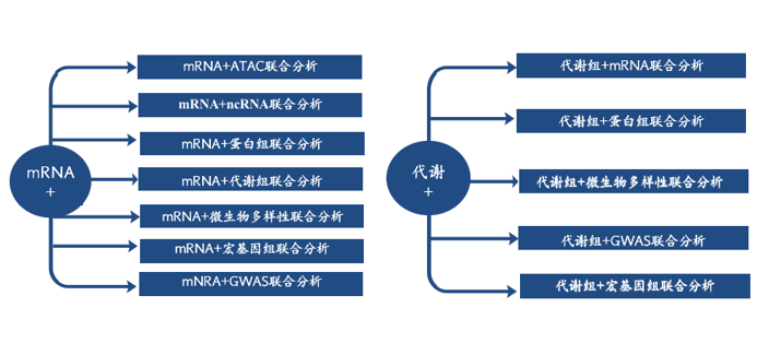 中心法則是遺傳的基礎,在中心法則中,RNA處于重要的中央樞紐地位,轉(zhuǎn)錄組作為生信科研中的“萬金油”,最大的特點就是“短平快”,是功能基因的研究利器,是利用率最高,最成熟的測序手段,在多組學聯(lián)合中扮演中重要的角色。代謝組是表型的直接體現(xiàn)者,“代謝組+ ”研究模式已經(jīng)在多個領域廣泛使用,成為深入研究科學問題,系統(tǒng)闡釋作用機制的利器。以下就是常見的基于這兩個組學的聯(lián)合分析策略。