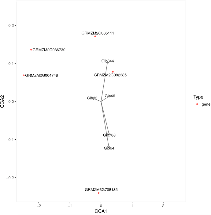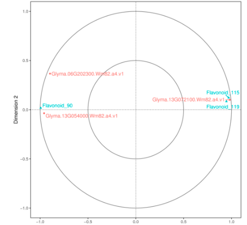 典型相關分析(canonical correlation analysis, CCA),是利用綜合變量對之間的相關關系來反映兩組指標之間的整體相關性的多元統(tǒng)計分析方法。對相關性網(wǎng)絡圖中的差異基因及差異代謝物進行典型相關分析,圖中以十字區(qū)分出四個區(qū)域,在同一個區(qū)域內(nèi),距原點越遠關聯(lián)性越高,在同一個象限內(nèi)距離較近的代謝物和基因之間相關聯(lián)的程度高,基于此結(jié)果可進一步挖掘和代謝物最相關的基因。