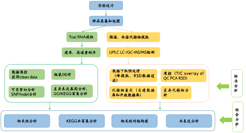 代謝與轉(zhuǎn)錄組聯(lián)合分析是基于兩個組學各自的標準分析結(jié)果,將差異代謝物和差異基因在代謝通路上的注釋結(jié)果進行關聯(lián)分析,可以在代謝通路上更好地解釋轉(zhuǎn)錄調(diào)控機制。常規(guī)的聯(lián)合分析內(nèi)容主要包括代謝組和轉(zhuǎn)錄組KEGG通路分析、KEGG共富集分析、相關性分析、差異基因和差異代謝物趨勢分析、典型相關性分析、限制性對應分析等內(nèi)容。