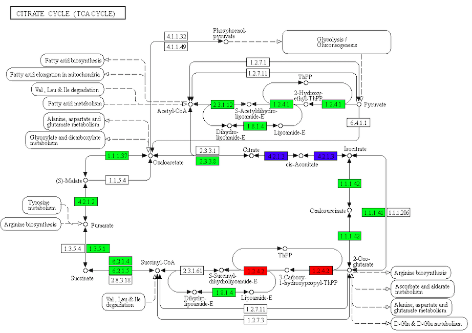 差異代謝物分析結(jié)果結(jié)合轉(zhuǎn)錄組差異基因分析結(jié)果,將相同分組的差異基因及差異代謝物同時映射到KEGG通路圖上,用綠色和紅色標注基因或代謝物表達量顯著下調(diào)或上調(diào)的節(jié)點,藍色標注既有上調(diào)又有下調(diào)的基因,更好的了解基因與代謝物之間的關系。