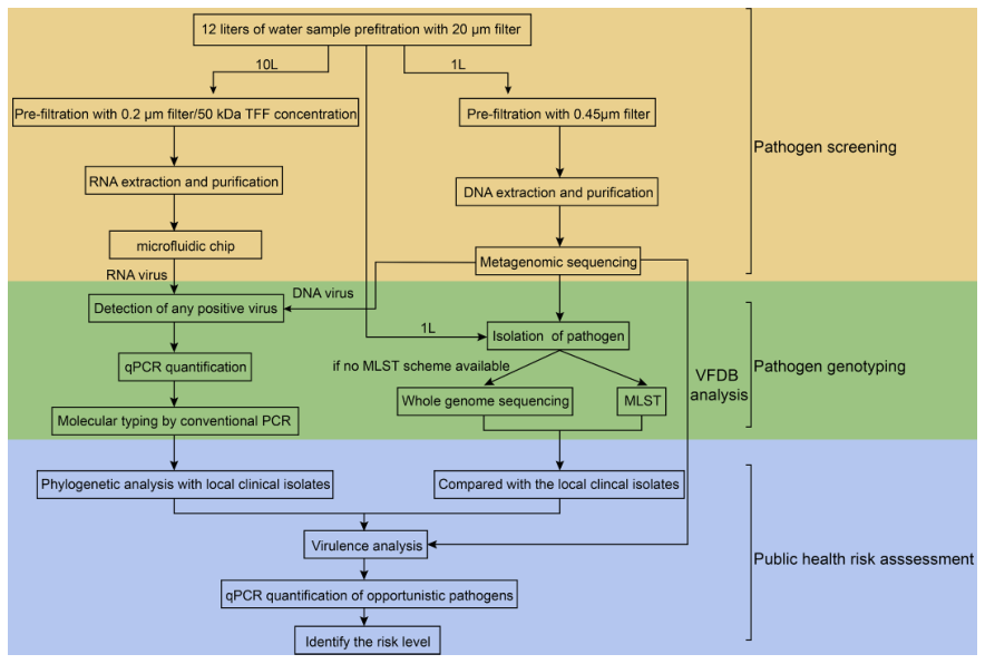 水生病原體可引起嚴(yán)重疾病,如霍亂、鉤端螺旋體病、傷寒或腹瀉。鑒于這些新出現(xiàn)的疾病的不可預(yù)測性和高度多樣性,水傳播病原體監(jiān)測的關(guān)鍵挑戰(zhàn)之一是優(yōu)先為局部暴發(fā)做好準(zhǔn)備。為應(yīng)對這些挑戰(zhàn),該研究分三個步驟進(jìn)行公共衛(wèi)生風(fēng)險評估:潛在病原體篩選、病原基因型確認(rèn)、與當(dāng)?shù)嘏R床資料比較。