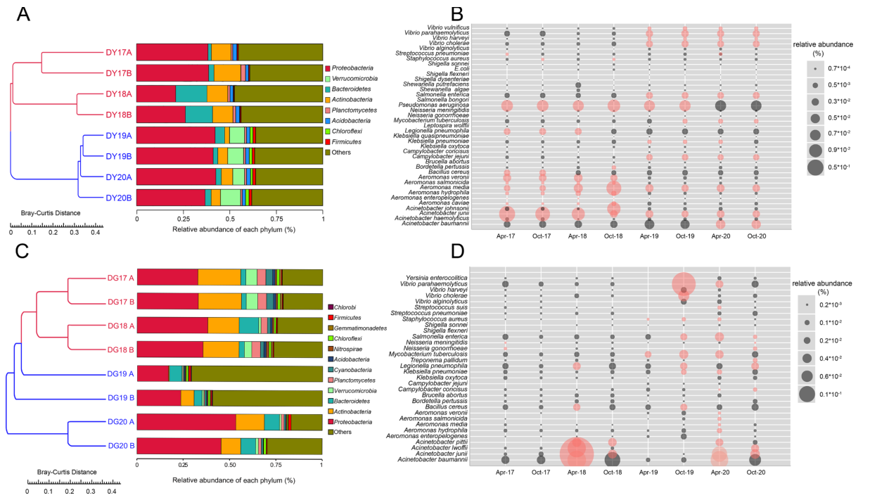 A:DY細(xì)菌群落相對豐度;B:DG中細(xì)菌群落相對豐度;C:DY樣品中細(xì)菌病原體的動態(tài);D:DG樣品中細(xì)菌病原體的動態(tài)