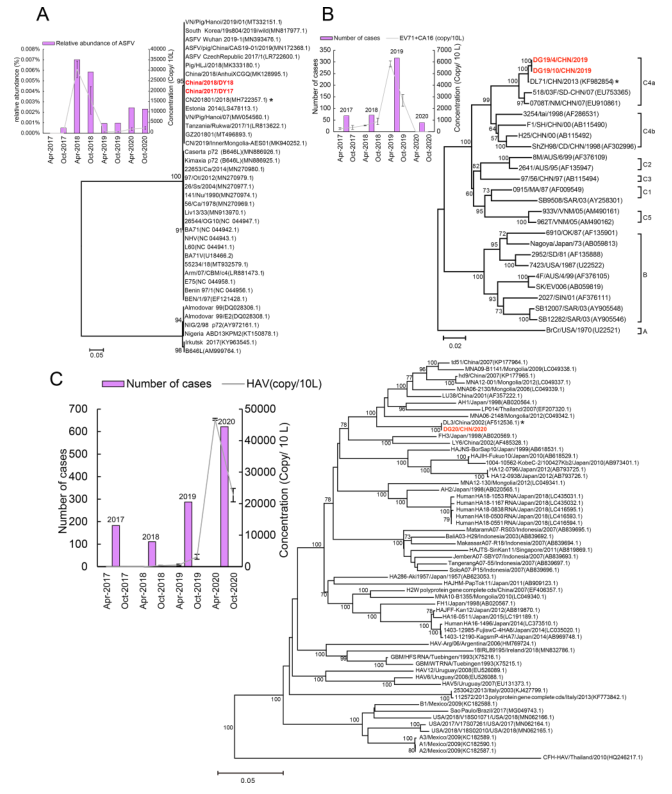 在DY發(fā)現(xiàn)了非洲豬瘟病毒(ASFV)和豬痘病毒(Swinpox Virus)等幾種病毒。ASFV在2017年10月被檢測到,并在2018年達(dá)到頂峰(圖6A),并通過qPCR證實(shí)。qPCR在2018年4月后連續(xù)檢測到ASFV,其中2018年4月的病毒載量為3.0×103拷貝/L。在DG地點(diǎn)未檢測到ASFV和Swinpox病毒,在兩個地點(diǎn)均未檢測到其它人畜共患病DNA病毒。通過高通量微流控芯片檢測檢測了40種致病性RNA病毒的存在。DY樣品中,經(jīng)qPCR確認(rèn),2019年僅檢測到諾如病毒、流行性腮腺炎病毒、鼻病毒和Human herpesvirus 6病毒。DG樣品中,2017年至2019年在樣本中檢測到human enterovirus 71 (EV71),2020年4月檢測到Coxsackievirus 16 (CA16)。