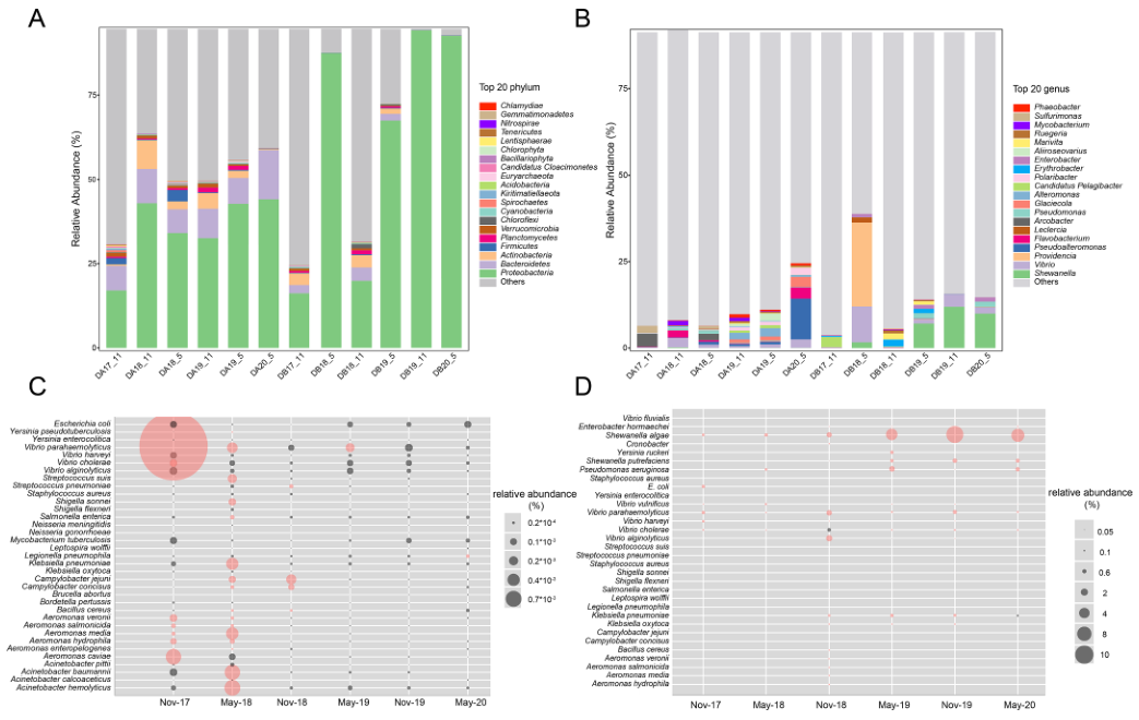 宏基因組數(shù)據(jù)中大約90%的reads與細(xì)菌相對應(yīng)。DA樣品中,變形菌門數(shù)量最多,其次是疣微菌門和放線菌(分別為35%和58%)(圖4A)。DB樣品中,變形菌門從2017年的50.1%增加到2020年的84.7%(圖4A)。兩個地點(diǎn)的微生物組成自2018年11月后出現(xiàn)了差異。在每個采樣時間,豐度 top20屬代表了微生物群落的35%到57%(圖5B)。在2019年(5.8%)和2020年(4.8%)采集的樣品中發(fā)現(xiàn)了弧菌屬(Arcobacter),而氣單胞菌屬(Aeromonas)和弧菌屬(Vibrio Spp)在2017年11月達(dá)到峰值(分別為0.43%和4.1%),在DA中還檢測到其它幾種細(xì)菌病原體(圖5C),所有時間均檢出假結(jié)核耶爾森菌(Yersinia pseudotuberculosis),2018年5月達(dá)到峰值(0.00013%),其他菌種也達(dá)到峰值,如不動桿菌屬、肺炎克雷伯菌屬等?;谂囵B(yǎng)的分析證實(shí),DA和DB位點(diǎn)分別存在22種和18種致病物種(圖5C,D)。對兩個城市的宏基因組數(shù)據(jù)進(jìn)行直接分類。每個數(shù)據(jù)集中的宏基因組組裝基因組(MAG)數(shù)量從7到23個不等,相對豐度在0.215%到1.325%之間。然而,對MAGs的注釋結(jié)果表明,它們都不含有毒力因子,說明該方法只能檢測高豐度的病原體。