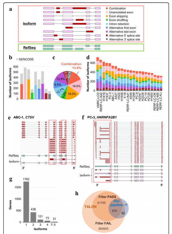 每種非小細(xì)胞肺癌細(xì)胞系的模式和數(shù)量代表特征性異常剪接事件(圖一d)。轉(zhuǎn)錄本的數(shù)量從323到725不等。不同細(xì)胞系的轉(zhuǎn)錄本組成不同。例如,內(nèi)含子保留和替代的最后一個(gè)外顯子構(gòu)成了RERF-LC-Ad2中大比例的同種類型,而未標(biāo)記的外顯子和外顯子跳躍是H1819的特征。這些結(jié)果表明,即使在細(xì)胞系中,異常剪接轉(zhuǎn)錄本的模式也是多樣的。剪接事件的一個(gè)新的復(fù)雜組合轉(zhuǎn)錄本的例子如圖1e所示。CTSV在ABC-1細(xì)胞中表達(dá)了兩種亞型,其中一種包括發(fā)生在外顯子2和3之間的替代性最后一個(gè)外顯子和內(nèi)含子保留的組合。