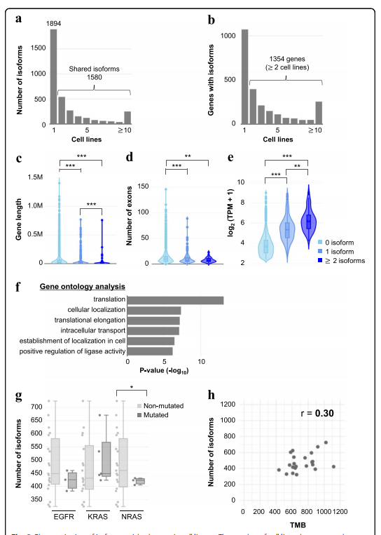 為了表明富含同種亞型的基因,作者比較了有或無的同種亞型基因長(zhǎng)度、外顯子數(shù)量和表達(dá)水平。與不含同種亞型的基因相比,含有至少一種同亞型的基因顯示出更短的序列長(zhǎng)度,并且由較少數(shù)量的外顯子組成;然而,發(fā)現(xiàn)含有同種亞型的基因的表達(dá)水平明顯升高。作者還發(fā)現(xiàn),同種亞型的多樣性與基因長(zhǎng)度和表達(dá)水平有關(guān)。具有一種同種亞型的細(xì)胞系的基因顯示了具有兩種或多種同種亞型在基因長(zhǎng)度和表達(dá)水平上的顯著差異。例如,在VMRC-LCD中,富含同種亞型的基因往往比只有一種同亞型的基因長(zhǎng)度更短,表達(dá)量更高(圖2c–e)。