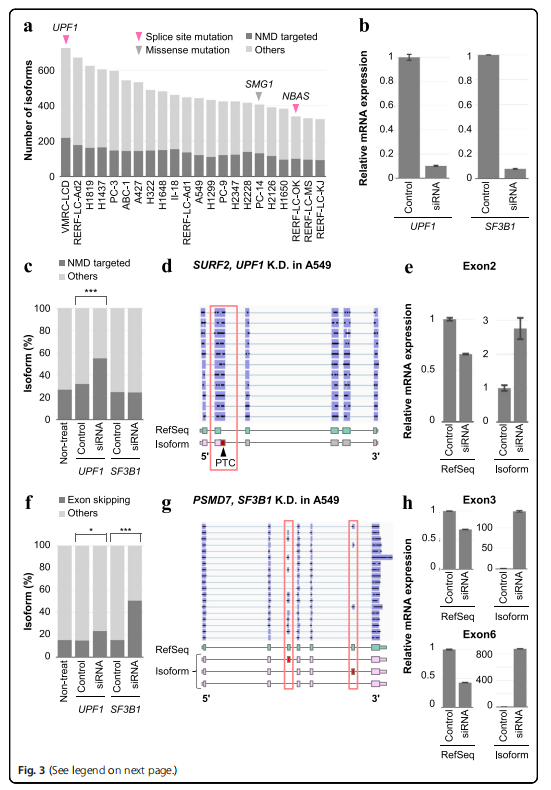 SF3B1是一種眾所周知的剪接因子,在多種疾病中發(fā)生突變,并導(dǎo)致異常剪接亞型的增加。作者通過SF3B1敲除評(píng)估剪接損傷的影響以及研究剪接因子的畸變是否影響轉(zhuǎn)錄本的產(chǎn)生。作者發(fā)現(xiàn)外顯子跳躍的比例顯著增加(圖3f),例如,PSMD7的外顯子3和6 在敲除后被改變(圖3g)。SF3B1-depleted的A549細(xì)胞中,外顯子跳躍亞型的表達(dá)PSMD7在中顯著增加,相反,RefSeq類型減少。為了確認(rèn)剪接位點(diǎn)近端區(qū)域的共有序列,作者收集了僅在SF3B1在A549細(xì)胞中敲除檢測(cè)到的外顯子跳躍異構(gòu)體。在這項(xiàng)分析中,作者用新的剪接連接的10 bp的區(qū)域,并跳過了外顯子。具有外顯子跳躍亞型的基因在翻譯和泛素-蛋白酶體途徑中顯示出顯著的富集,因此,這些因素的中斷可能會(huì)改變至少一些異常剪接亞型,并可能導(dǎo)致它們?cè)诜伟┘?xì)胞中的積累。