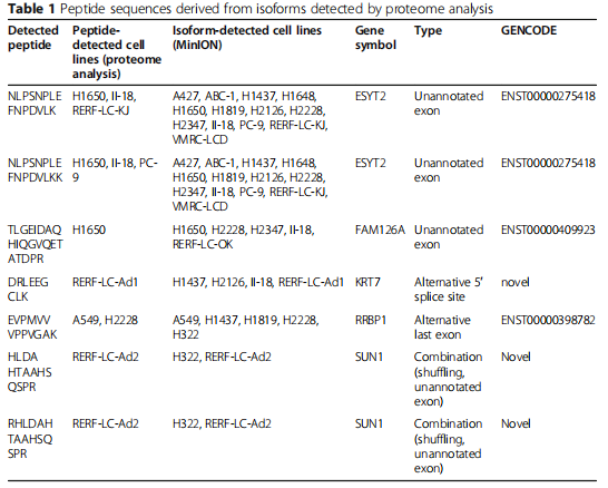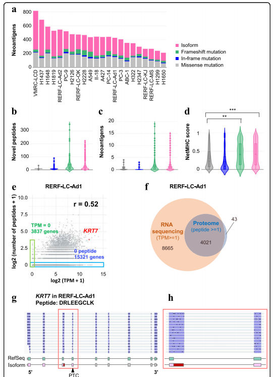 為了從實(shí)驗(yàn)上驗(yàn)證異常的轉(zhuǎn)錄本是否被翻譯成蛋白質(zhì),對(duì)11種細(xì)胞系(A427、A549、H1650、H2228、II-18、PC-9、RERF-LC-Ad1、RERF-LC-Ad2、RERF-LC-KJ、RERF-LC-MS和VMRC-LCD)采用了使用液相色譜結(jié)合串聯(lián)質(zhì)譜(LC/MS/MS)對(duì)于多肽識(shí)別,作者基于每個(gè)細(xì)胞系的MinION數(shù)據(jù)定制了肽序列數(shù)據(jù)庫。如前所述,普通轉(zhuǎn)錄組測(cè)序由于其測(cè)序能力,顯示出比LC/MS/MS蛋白質(zhì)組學(xué)更高的基因覆蓋率。通過液相色譜/質(zhì)譜/蛋白質(zhì)組學(xué)檢測(cè)的每個(gè)基因的肽數(shù)與通過轉(zhuǎn)錄組測(cè)序數(shù)據(jù)計(jì)算的TPM相關(guān)(r= 0.52,圖4e)而且LC/MS/MS蛋白質(zhì)組學(xué)檢測(cè)到的大部分基因也被轉(zhuǎn)錄組測(cè)序覆蓋(圖4f)。作者成功地檢測(cè)到7個(gè)翻譯自異常剪接亞型特異性區(qū)域的多肽。例如,衍生自外顯子3中具有選擇性5’剪接的轉(zhuǎn)錄本的多肽KRT7存在于RERF-LC-Ad1(圖4g)。在GENCODE數(shù)據(jù)庫中沒有發(fā)現(xiàn)這種轉(zhuǎn)錄本,但是在ENST00000547613中觀察到了這種同中型特異性連接,其被認(rèn)為是處理過的轉(zhuǎn)錄本。MinION也證實(shí)了在H1437、H2126和II-18中的表達(dá)(表1).此外,這種轉(zhuǎn)錄本有可能產(chǎn)生幾個(gè)新抗原,這些新抗原是由NetMHC預(yù)測(cè)的。這些結(jié)果表明,一些異常剪接亞型被真正翻譯成肽,并可能在癌癥中產(chǎn)生新抗原中發(fā)揮作用。
