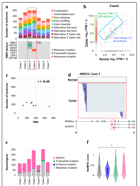 為了檢查體內(nèi)癌細(xì)胞中是否也存在異常剪接轉(zhuǎn)錄本,作者接下來分析了臨床肺癌標(biāo)本。應(yīng)用與臨床樣本細(xì)胞系分析相同的分析方案,能夠識(shí)別每個(gè)患者的異常剪接亞型(圖5a)。作者選擇了在腫瘤樣本中表達(dá)水平比非腫瘤樣本高至少兩倍的轉(zhuǎn)錄本(圖5b)在所有臨床樣本中鑒定出982種富含癌癥的剪接亞型。其中,448種亞型在參考序列或基因代碼。異常亞型的數(shù)量和TMB之間沒有顯著的相關(guān)性(圖5c)。作為檢測(cè)到的轉(zhuǎn)錄本的一個(gè)例子,在SMOC2如圖1所示5d和僅在病例3的腫瘤中表達(dá)。類似于細(xì)胞系分析的結(jié)果,作者可以識(shí)別獨(dú)立剪接事件的幾種獨(dú)特組合模式,這些模式占這些未標(biāo)記亞型的14.5%。還確定了保留在癌細(xì)胞中的潛在的NMD靶向亞型,這表明NMD機(jī)制在相應(yīng)的癌癥中被破壞。值得注意的是,在病例3和4中,發(fā)現(xiàn)*大數(shù)量的潛在NMD靶向亞型在關(guān)鍵NMD因子中存在移碼或無義突變,UPF3B和SMG8(圖5a)。