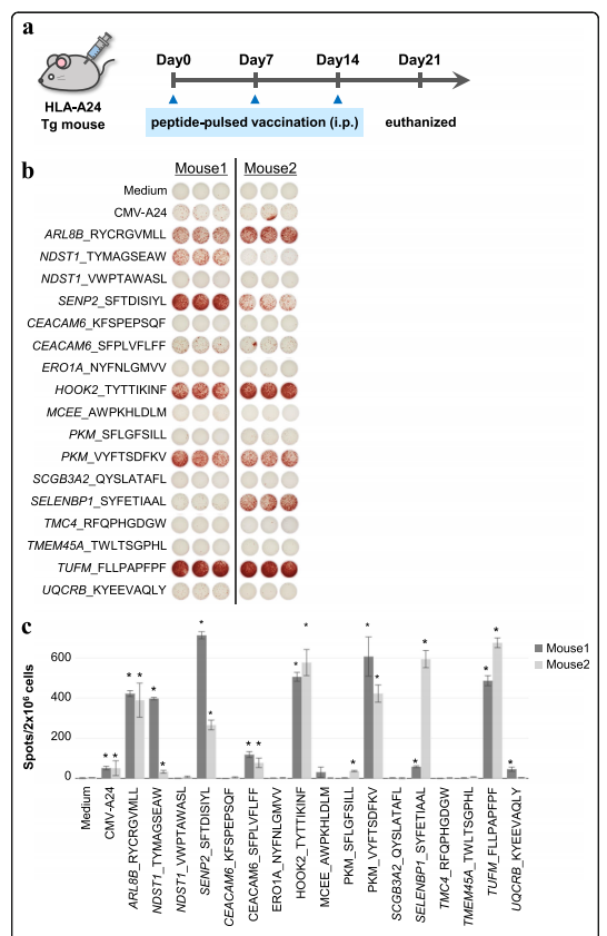 為了評(píng)估從異常剪接亞型和移碼突變中鑒定的肽的抗原性,作者根據(jù)圖6a所示的方案用候選肽免疫HLA-A24轉(zhuǎn)基因小鼠。作者根據(jù)人類白細(xì)胞抗原-α:24:02的網(wǎng)絡(luò)MHC評(píng)分選擇了17種候選肽(表2)。作者通過BLAST-P證實(shí)了該肽序列與人或小鼠蛋白質(zhì)數(shù)據(jù)庫中的序列沒有相似性,最后一次接種疫苗一周后,作者從小鼠中分離出脾細(xì)胞,并對(duì)分離物進(jìn)行酶聯(lián)免疫吸附斑點(diǎn)(ELISpot)分析。通過這樣做,作者試圖檢測(cè)新抗原特異性脾淋巴細(xì)胞反應(yīng)。酶聯(lián)免疫吸附試驗(yàn)結(jié)果顯示,17個(gè)多肽中有8個(gè)誘導(dǎo)顯著高的干擾素-γ產(chǎn)生(n= 2)與PBS組和單獨(dú)佐劑組相比(圖6b,c)。這些結(jié)果表明,來自剪接亞型和移碼突變的多肽可以通過與人類白細(xì)胞抗原的相互作用激活T細(xì)胞反應(yīng)。