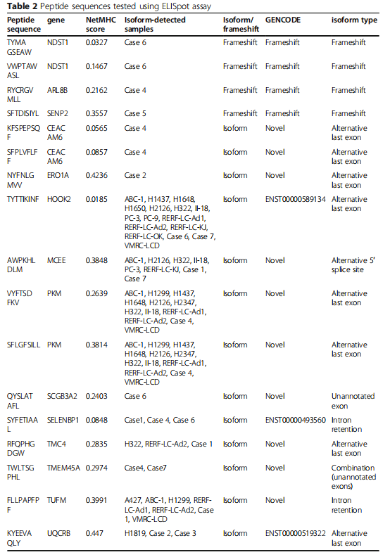 結(jié)果:對(duì)22組細(xì)胞系進(jìn)行全長(zhǎng)轉(zhuǎn)錄組測(cè)序,共鑒定出2021種新的剪接異構(gòu)體。其中一些異構(gòu)體的蛋白質(zhì)表達(dá)通過蛋白質(zhì)組分析進(jìn)行驗(yàn)證。無義介導(dǎo)的mRNA衰減因子(NMD)UPF1的降低和剪接因子SF3B1的減少增加了異常轉(zhuǎn)錄本的比例。NetMHC對(duì)每種HLA分子結(jié)合的親和力的評(píng)估顯示,一些亞型可能產(chǎn)生新抗原候選體,還在7個(gè)非小細(xì)胞肺癌標(biāo)本中發(fā)現(xiàn)了剪接亞型。酶聯(lián)免疫吸附斑點(diǎn)試驗(yàn)表明,大約一半的候選肽有可能通過與人類白細(xì)胞抗原分子的相互作用激活T細(xì)胞反應(yīng)。大約一半的多肽通過與HLA分子的相互作用具有激活T細(xì)胞反應(yīng)的潛力。最后,作者通過參考構(gòu)建的目錄來估計(jì)癌癥基因組圖譜(TCGA)數(shù)據(jù)庫中的亞型數(shù)量,發(fā)現(xiàn)NMD因子的破壞與TCGA-Lung Adenocarcinoma數(shù)據(jù)集中發(fā)現(xiàn)的剪接亞型數(shù)量顯著相關(guān)。