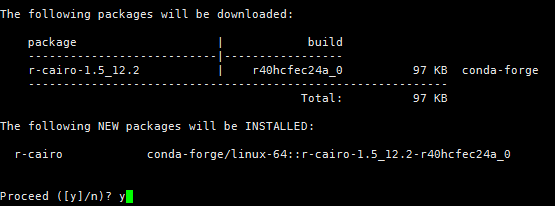 然后嘗試conda install -c conda-forge r-cairo(注意包的名字用小寫字母)來安裝。出來這個敲y,一般都能安裝成功。conda安裝R包首先要安裝有conda,然后激活conda環(huán)境,在命令行而不是交互界面去安裝。