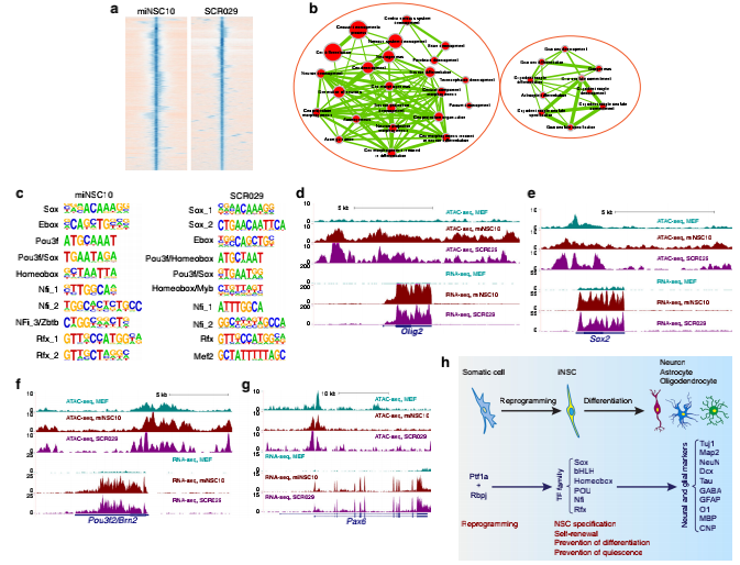 由體細(xì)胞重編程的誘導(dǎo)性神經(jīng)干細(xì)胞(induced neural stem cells,iNSC)在神經(jīng)疾病的細(xì)胞替代療法和體外建模中具有巨大的潛力。已有研究證明將成纖維細(xì)胞直接轉(zhuǎn)化成iNSC的方法依賴于幾個(gè)關(guān)鍵的神經(jīng)前體細(xì)胞轉(zhuǎn)錄因子(TF),這就提出了一個(gè)問(wèn)題:這種直接的重編程是否可以由非神經(jīng)前體細(xì)胞調(diào)控TF來(lái)實(shí)現(xiàn)。通過(guò)RNA-seq和ATAC-seq分析結(jié)果,作者發(fā)現(xiàn)非神經(jīng)前體細(xì)胞調(diào)控TFPtf1a可以將小鼠和人的成纖維細(xì)胞直接重編程為具有分化出神經(jīng)元、星形膠質(zhì)細(xì)胞和少突膠質(zhì)細(xì)胞的潛能和自我更新能力的iNSC,并在移植后可以改善阿爾茨海默病小鼠模型的認(rèn)知功能障礙。相比于MEF,miNSC10和SCR029細(xì)胞,Ptf1a重編程的miNSC自我更新和維持所需要的Notch信號(hào)通路相關(guān)基因均顯著上調(diào),并且這些位點(diǎn)也顯示出差異的ATAC-seq圖譜。說(shuō)明Ptf1a的重編程活性是通過(guò)與Rbpj結(jié)合的非Notch信號(hào)依賴途徑,來(lái)維持NSC特化、自我更新和體內(nèi)穩(wěn)態(tài)。同時(shí)作者的數(shù)據(jù)確定了這是一種用于研究和治療的更安全的非典型iNSC。