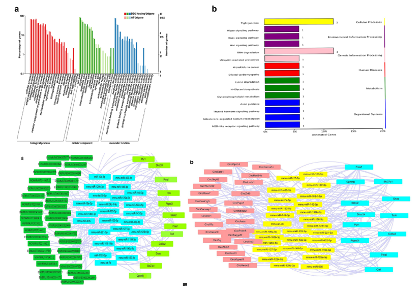 2. 差異非編碼RNA靶基因預(yù)測:GO term和pathway分析差異表達(dá)miRNA、lncRNA的靶基因以及circRNA的宿主基因,結(jié)果顯示circRNA的宿主基因主要富集在細(xì)胞過程和單個生物體過程中;miRNA的靶基因主要富集于染色質(zhì)結(jié)合和核內(nèi)鈣離子結(jié)合;lncRNA相關(guān)基因的功能是翻譯后修飾。