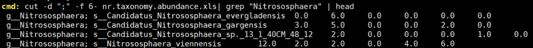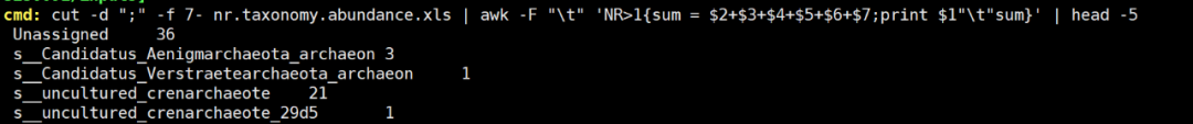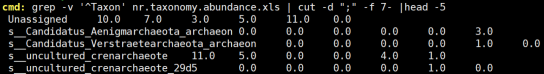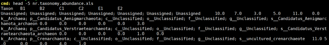 在實(shí)際運(yùn)用過(guò)程中,我們通常根據(jù)需要,通過(guò)管道符“|”同時(shí)使用好幾種生物信息學(xué)Linux命令,避免花費(fèi)大量時(shí)間找軟件、寫(xiě)代碼,有些情況下可以代替Excel等辦公軟件。如下就是一些linux命令的高級(jí)使用實(shí)例。如下是一個(gè)宏基因組的NR注釋結(jié)果示例文件: