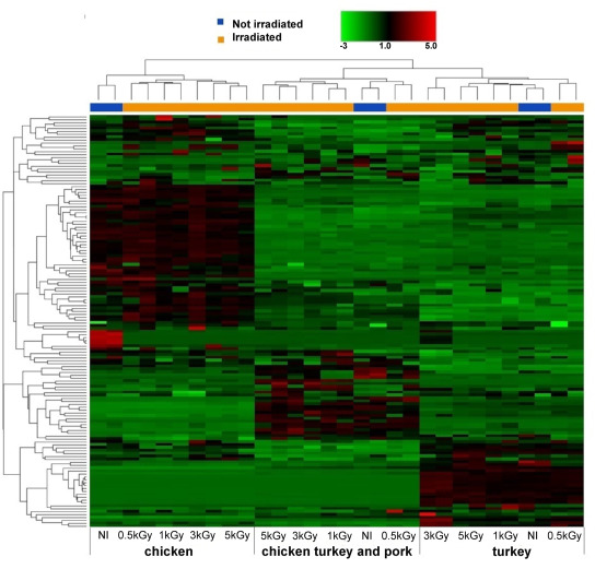 輻照是一種高效滅菌方法,對肉類保存具有重要作用。本研究基于定性非靶向?HPLC-Orbitrap?代謝組學方法,旨在估計輻照雞肉、火雞和混合(雞肉、火雞和豬肉)絞肉的全局代謝組譜變化,以評估可能存在的食品安全關于代謝組改變的問題。通過LC-MS共鑒定了?402?種代謝物,并且所有三種基質都表現(xiàn)出特定的代謝組譜,該譜組不受應用五種不同輻照強度水平的顯著影響。特別是,所有三個肉類類別都顯示出以下共同特征: