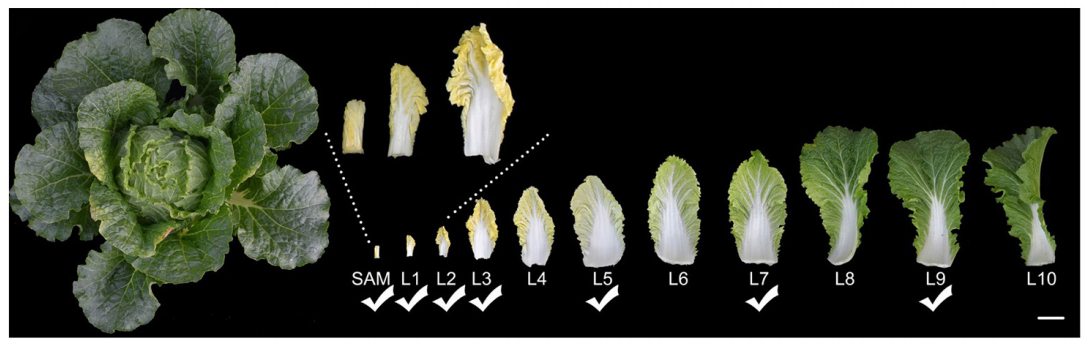 在溫室盆栽大白菜,使用11周大的植物進(jìn)行取樣。隨機(jī)選擇兩個(gè)正常生長(zhǎng)的大白菜。從外葉到內(nèi)葉的所有頭葉(葉長(zhǎng)>2cm)按順序分離收集,而帶有莖尖分生組織(SAM)的幼葉和小內(nèi)葉(葉長(zhǎng)<2cm)不分離,按順序收集。從每個(gè)大白菜頭部共得到30片葉子。從內(nèi)到外,每3片形態(tài)相似、大小相近的葉子為一葉輪,共得到10葉輪葉。
