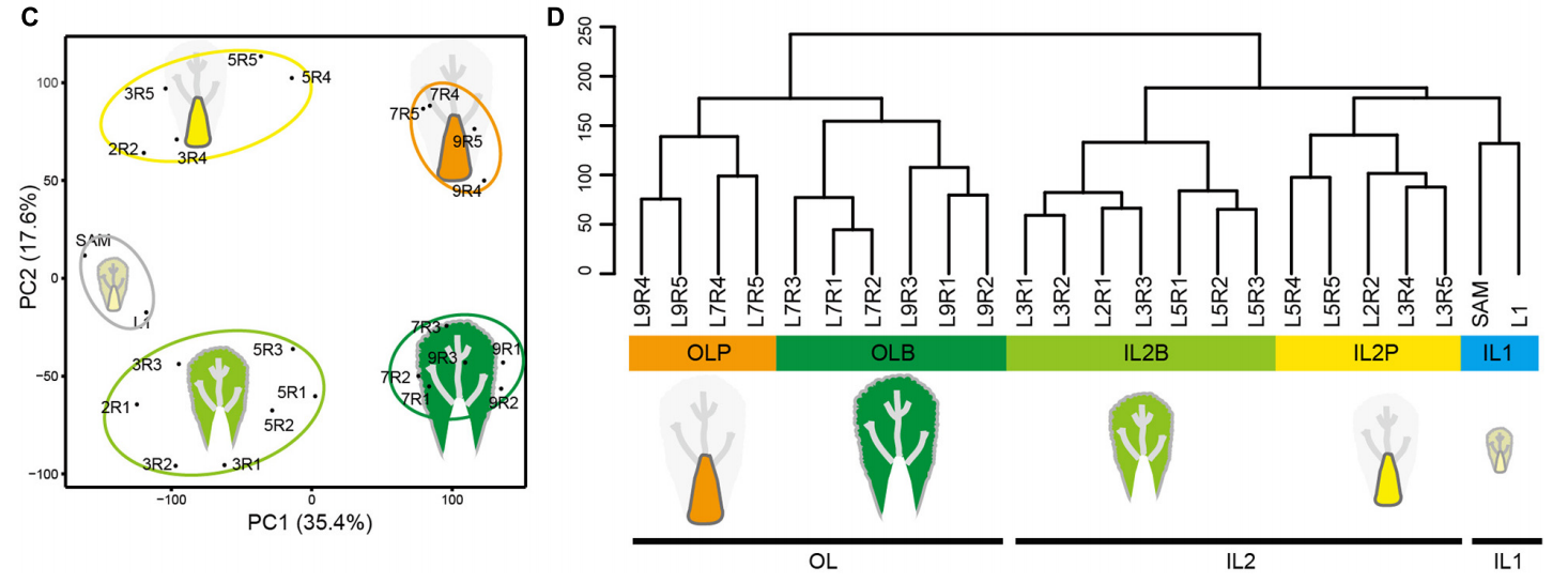 主成分分析(PCA)顯示沿主成分(PC)1和2有明顯的分離。PC1根據(jù)與SAM的距離將葉片樣本分開(kāi),而PC2將葉片和葉柄組織分開(kāi)。層次聚類(lèi)分析將樣本分為五類(lèi),與葉子形態(tài)分化一致。SAM和L1的樣本形成內(nèi)葉1(IL1)最接近莖尖的組織。內(nèi)葉2的葉片(IL2B)和內(nèi)葉2的葉柄(IL2P)代表L2-L5的葉片和葉柄組織,而外葉(OLB)和外葉柄(OLP)代表L2-L5的葉片和葉柄組織外葉(L7和L9),與葉子形態(tài)分化一致。