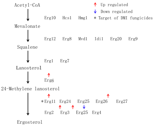 在真菌中,麥角甾醇是由乙酰輔酶A(乙酰輔酶A)通過復雜途徑合成的。釀酒酵母中的麥角甾醇生物合成步驟研究較為透徹,共有21個基因參與麥角甾醇生物合成。我們從C. fructicola中找到了相關(guān)同源基因。在苯醚甲環(huán)唑脅迫下,在參與麥角甾醇生物合成的基因中,與對照相比, Erg11(DMI殺菌劑的靶標,在真菌中被稱為CYP51)基因被發(fā)現(xiàn)上調(diào)。Erg6、Erg27、Erg3和Erg5基因表達量也上調(diào)。與對照組相比,Erg4基因受到抑制。苯醚甲環(huán)唑處理后,其他15個基因的表達水平?jīng)]有顯著變化。說明:DMI類殺菌劑對炭疽菌產(chǎn)孢的促進作用可能與麥角甾醇合成途徑中基因表達量的變化及甾醇種類變化有關(guān)。