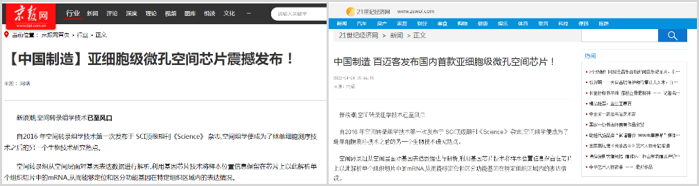 4月20日,百邁客生物在北京發(fā)布了亞細(xì)胞級(jí)微孔空間組學(xué)芯片“百創(chuàng)S1000”,該芯片可以讓研究者們可以結(jié)合不同階段圖譜數(shù)據(jù),獲得全面的亞細(xì)胞級(jí)時(shí)空動(dòng)態(tài)表達(dá)圖譜,從而為疾病的診斷治療及藥物研發(fā)提供更有力的決策依據(jù),相比目前國(guó)外空間轉(zhuǎn)錄組測(cè)序芯片精度提高了近400倍,同時(shí)還能拍攝高清HE染色圖片!