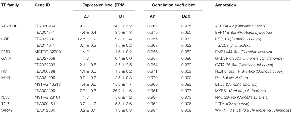 上述結(jié)果表明,在紫色花朵中,具有特征的揮發(fā)性和非揮發(fā)性BPs分別為AP和DpG。計(jì)算了Ps和TFs之間的皮爾遜相關(guān)系數(shù),發(fā)現(xiàn)這兩個(gè)茶葉品種之間存在顯著差異。AP和DpG的14個(gè)TF的相關(guān)系數(shù)大于0.95(表1)。他們屬于AP2/ERF、bZIP、EMP、GATA、HS、MYB、NAC、TCP和WRKY家族,在紫色花種分別高出1.6–6.7倍,其中MYB、AP2/ERF、bZIP、TCP和GATA的表達(dá)水平高。