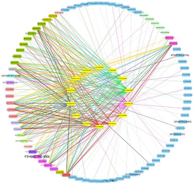 作者分析了14個(gè)TFs與上述結(jié)構(gòu)基因之間的相關(guān)性,以發(fā)現(xiàn)潛在的調(diào)節(jié)機(jī)制(圖6)。大多數(shù)TFs與PAR、SAMT和SDR高度相關(guān),這有助于揮發(fā)性BPS合成;以及4CL、BZ1、CHS、F30H、F3050H、FLS和LAR,它們有助于非揮發(fā)性BPs合成;以及ADT和DAHP在苯丙氨酸上游生物合成中起作用。相比之下,這些TFs并不關(guān)注花色素苷運(yùn)輸?shù)奶囟ɑ颉?/p>