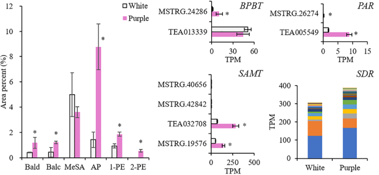 然后,作者研究了四種直接合成苯甲酸芐酯、MeSA、2-PE和AP的基因,分別是苯甲醇鄰苯甲酰轉(zhuǎn)移酶(BPBT;KO id為K19861)、水楊酸羧基甲基轉(zhuǎn)移酶(SAMT;KO id為K21483)、苯乙醛還原酶(PAR)和短鏈脫氫酶/還原酶(SDR)。他們都在紫色茶花中高表達(dá)。通過(guò)柱狀圖分析了兩個(gè)品種之間存在顯著差異的22個(gè)SDR基因成員。在紫色茶花中,22個(gè)SDR基因的總表達(dá)量高出1.3倍,其中表達(dá)水平高的成員(TEA025281)也是如此。BPBT和PAR表達(dá)水平較低,分別為15和5倍。兩個(gè)SAMT成員在茶花中高度誘導(dǎo),在紫色花瓣中高出3-4倍。這些結(jié)果證明紫茶花中揮發(fā)性BPs的生物合成能力更強(qiáng)。