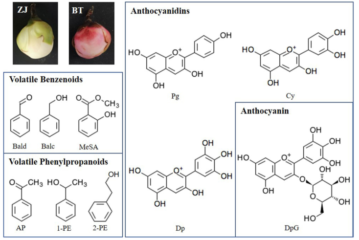 在這項(xiàng)研究中,為了研究揮發(fā)性和非揮發(fā)性BPs對(duì)紫色茶花的氣味和顏色的作用,在白色(ZJ品種)和紫色(BT品種)茶花瓣中測(cè)定了BP型香氣和花青素(圖1),確定了生物合成和花青素運(yùn)輸相關(guān)途徑中的基因表達(dá)譜,并分析了調(diào)節(jié)ZJ和BT之間氣味和顏色變化可能的TFs。