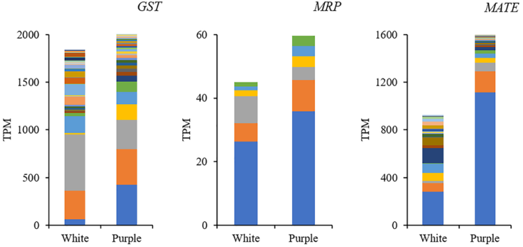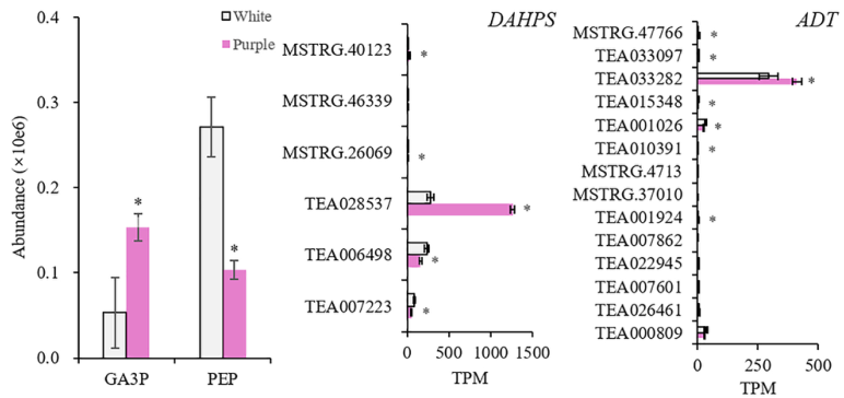 為了進(jìn)一步揭示兩個(gè)茶樹(shù)品種之間BPs的不同合成機(jī)制,檢測(cè)了上游化合物和基因(圖5)。在紫色花瓣中,3-磷酸甘油醛(GA3P)增加了2.9倍,而磷酸烯醇式丙酮酸(PEP)僅為白色花瓣的38%,這表明紫色花瓣中的碳代謝被促進(jìn),但它可能不會(huì)進(jìn)入苯丙氨酸的下游代謝。PEP的降低可能是由于高度誘導(dǎo)的3-脫氧-D-阿拉伯庚糖酸7-磷酸合成酶(DAHPS)所致。在紫色花瓣中,DAHPS基因的主要成員TEA028537的表達(dá)量高出4.6倍。芳醇脫水酶/預(yù)苯酸脫水酶(ADT)催化芳醇生成苯丙氨酸。它的主要成員TEA033282在紫色花瓣中略微升高,高出1.3倍。此外,合成的花青素在顯示顏色之前需要運(yùn)輸?shù)揭号葜?,該過(guò)程與谷胱甘肽S-轉(zhuǎn)移酶(GST)、多藥耐藥相關(guān)蛋白(MRP)以及多藥和毒素?cái)D壓(MATE)有關(guān)。把這些顯著差異基因的表達(dá)量加起來(lái),發(fā)現(xiàn)紫色花瓣的總表達(dá)量都較高,分別高出1.1, 1. 3和1.7倍。紫色花瓣中這三個(gè)基因的主要成員(TEA015341、TEA001531和TEA006958),表達(dá)量分別高出6.9, 1. 4,和3.9倍。