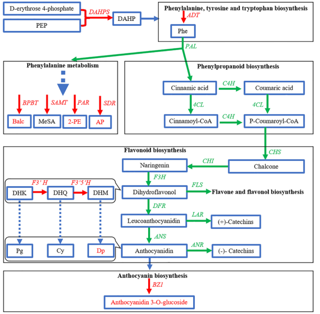 苯類(lèi)化合物,尤其是苯丙烷,是植物顏色和香氣的主要來(lái)源,它們幫助植物吸引傳粉動(dòng)物或阻止外敵侵害。類(lèi)苯和類(lèi)苯丙烷(BPs),例如類(lèi)黃酮,是一組次級(jí)代謝產(chǎn)物,來(lái)源于莽草酸途徑中的兩種芳香族氨基酸苯丙氨酸(Phe)和酪氨酸。
