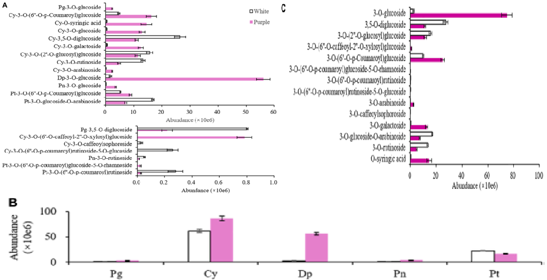 Dp只有一種糖苷形式,但它在紫色花瓣中含量豐富。紫色花瓣中的主要花色苷是delphinidin-3-O-glucoside,Cy-3-O-(6’’-O-p-coumaroyl)glucoside, ?Cy-O-syringic ?acid, Cy-3-O-glucoside和Cy-3-O-galactoside,?而在白色茶花中,則是 Cy-3,5-O-diglucoside, Pt-3-O-glucoside-O-arabinoside,? Cy-3-O-(2’’-O-glucosyl)glucoside和 Cy-3-O-rutinoside 。除苷元外,這20種花青素中的另一半含有13種糖苷和1種丁香酸(圖3C)。在白色花瓣中,花青素含量高的是3,5-O-二葡萄糖苷,而在紫色花瓣中,3-O-葡萄糖苷含量極高。因此,兩個(gè)茶樹(shù)品種之間花青素的大差異是DpG,這可能是紫色花呈紫色的主要原因,以及紫色花瓣中Dp和葡萄糖的生物合成可能已增強(qiáng)。