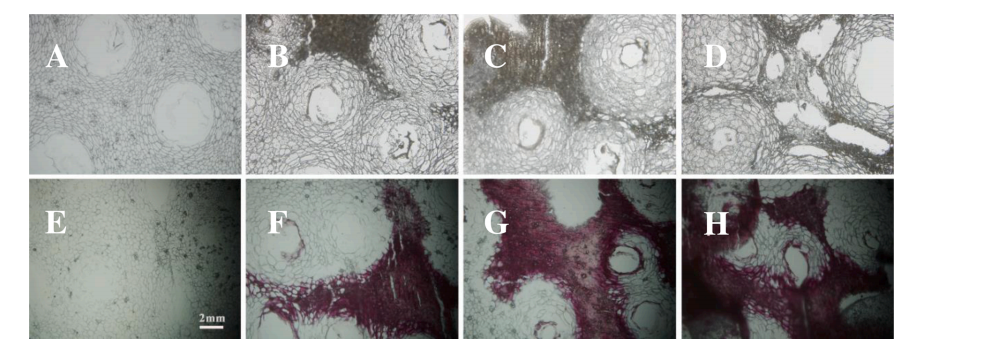 為了從形態(tài)學角度揭示油斑病對檸檬皮中木質(zhì)素積累的影響,采用間苯三酚-鹽酸反應對健康和油斑病檸檬皮的橫截面進行了木質(zhì)素化研究。在染色前,健康檸檬皮的細胞排列整齊,沒有塌陷,而輕度油斑病檸檬皮的細胞似乎塌陷并堆積在一起。隨著油斑病嚴重程度的增加,細胞的堆積越來越明顯,細胞間組織的塌陷導致不同程度的破裂,特別是在油斑病嚴重的檸檬皮中,可以觀察到許多裂痕洞(Fig. 4)。