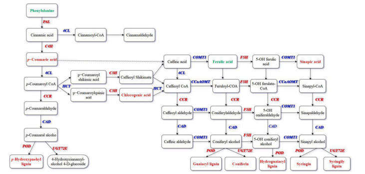 本研究采用多種生物學方法對青檸檬油斑病木質(zhì)素積累的機制進行了分析。油斑病損傷檸檬皮的初級代謝物(尤其是葡萄糖)顯著降低,次級代謝物(尤其是木質(zhì)素)顯著增加。檸檬皮在油斑病下發(fā)生嚴重的木質(zhì)化,苯丙素的生物合成被顯著激活,與木質(zhì)素積累相關的DEGs有79個,其中65個基因顯著上調(diào),尤其是PAL、C4H、CCR、F5H POD和UGT72E基因。油斑病損害的檸檬皮具有較高水平的木質(zhì)素積累和增強對病原真菌的防御。該研究是首次報道檸檬油斑病對病原真菌表現(xiàn)出較高的抗性。