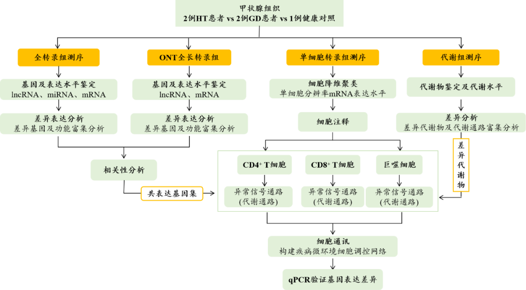 本研究基于HT患者、GD患者和健康對(duì)照甲狀腺組織的單細(xì)胞RNA測(cè)序、全轉(zhuǎn)錄組測(cè)序、ONT全長(zhǎng)轉(zhuǎn)錄組測(cè)序和代謝組測(cè)序數(shù)據(jù),探討了HT和GD疾病微環(huán)境中基因表達(dá)失調(diào)和代謝信號(hào)異常的免疫細(xì)胞,構(gòu)建了免疫細(xì)胞的全局調(diào)節(jié)網(wǎng)絡(luò),為進(jìn)一步了解HT和GD免疫紊亂和代謝異常介導(dǎo)的疾病機(jī)制、更好地干預(yù)和治療疾病提供了科學(xué)的理論指導(dǎo)和研究基礎(chǔ)。