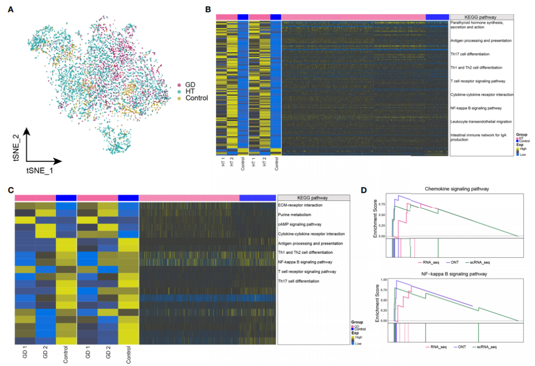 人類自身免疫性甲狀腺疾病?(AITD)?是最常見(jiàn)的器官特異性自身免疫性疾病,也是甲狀腺功能障礙和非地方性甲狀腺腫的最常見(jiàn)原因,主要表現(xiàn)為彌漫性甲狀腺腫(Graves’disease,GD)和橋本甲狀腺炎(Hashimoto’s?thyroiditis,HT);HT和GD具有不同的臨床特征,但它們?cè)诮M織損傷方面是相似的,包括體內(nèi)淋巴細(xì)胞浸潤(rùn)。研究表明,T淋巴細(xì)胞及其特異性細(xì)胞因子作為免疫不可或缺的組成部分,在AITD的發(fā)生中起關(guān)鍵作用,例如調(diào)節(jié)性T細(xì)胞(Tregs)和輔助T細(xì)胞17?(Th17)的失調(diào)、Th1/Th2失衡在AITD的發(fā)病機(jī)制中起著關(guān)鍵作用,但這些細(xì)胞亞群免疫功能障礙引起的致病分子機(jī)制在很大程度上仍未得到解釋。