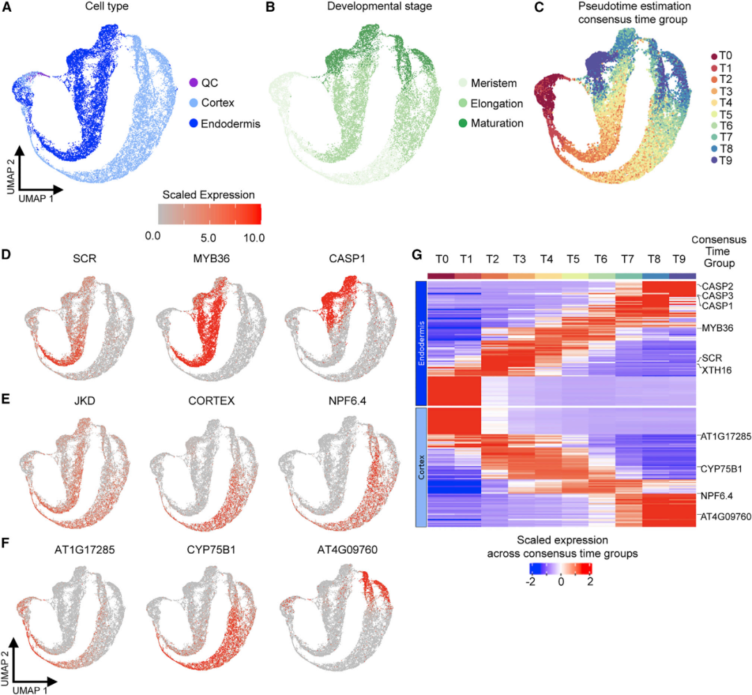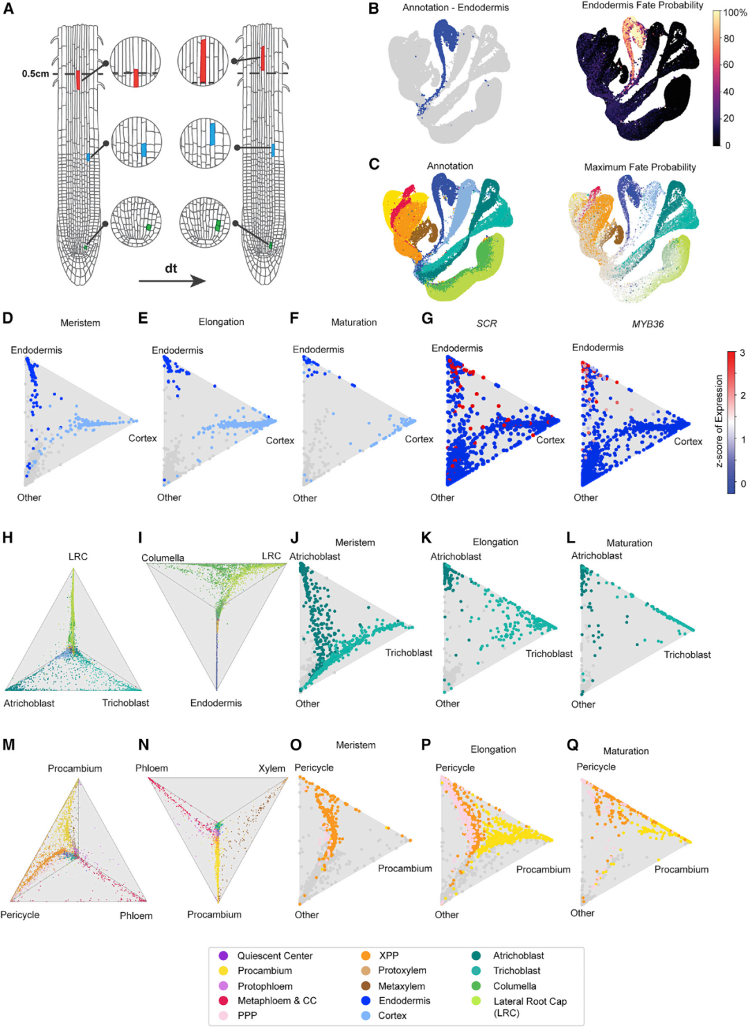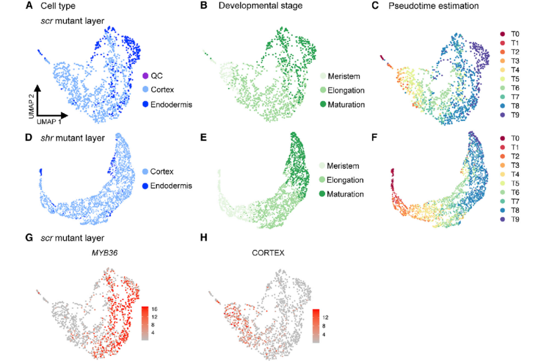 這篇文章通過對不同發(fā)育階段的擬南芥根細胞進行scRNA-seq,構建了十萬級水平的根細胞基因時空表達圖譜,并利用理想傳輸理論(OT)推斷出了細胞系的發(fā)育軌跡。同時,通過比較scr和shr突變體的scRNA-seq數(shù)據(jù),從單細胞水平闡釋了scr突變層細胞同時具有皮層和內(nèi)皮層混合特性,并指出了其發(fā)育軌跡上的特性轉(zhuǎn)變。最后,使用內(nèi)皮層和皮層轉(zhuǎn)錄報告基因?qū)σ陨辖Y論進行了體內(nèi)驗證。