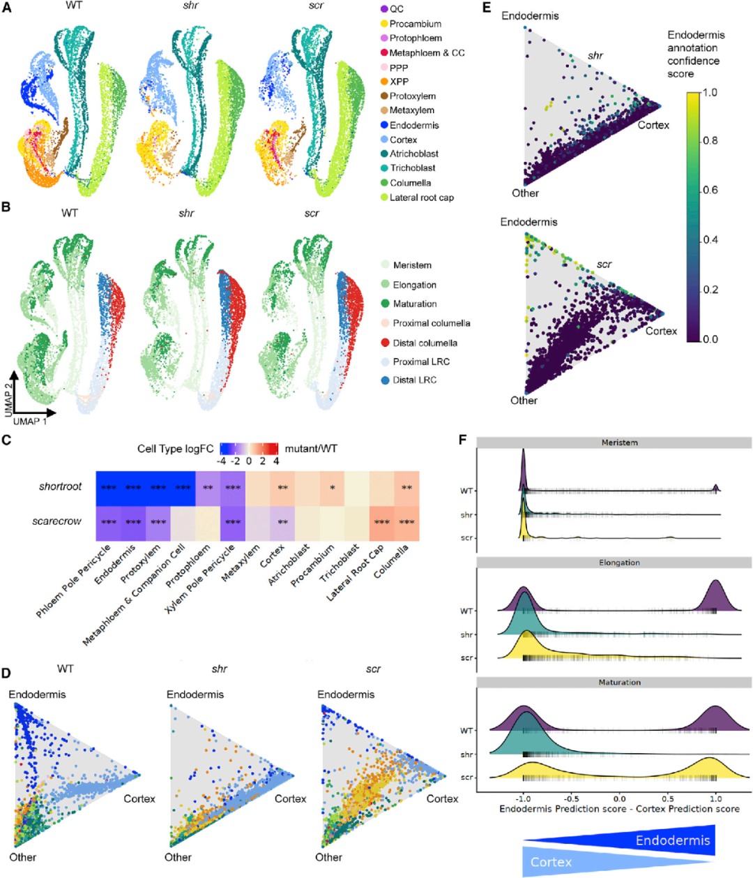 圖5 圖譜揭示了shr和scr突變體的細胞類型豐度和特性變化