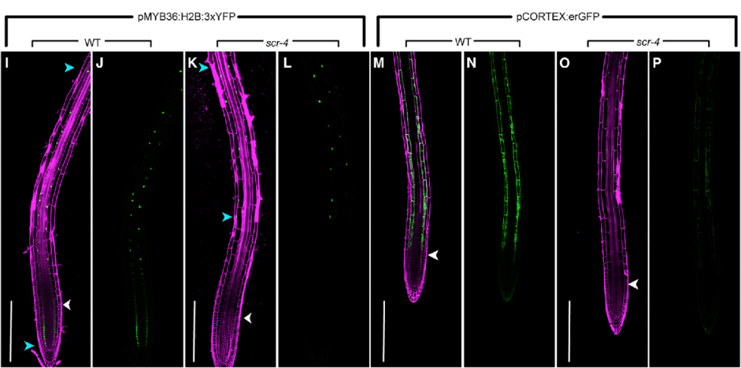 為了在體內(nèi)進一步對scRNA-seq得到的結論進行驗證,作者驗證了皮層和內(nèi)皮層標志物的空間表達模式在scr突變層是否會發(fā)生改變。在WT中,內(nèi)皮層標志基因MYB36和皮層轉(zhuǎn)錄報告基因AT1G09750?(CORTEX)在它們各自類型的伸長區(qū)表達,MYB36在分生區(qū)的內(nèi)皮層也表達。但scr突變體中,MYB36轉(zhuǎn)錄報告基因的表達僅在晚期延伸區(qū)和成熟區(qū)可見,皮層轉(zhuǎn)錄報告基因在延伸區(qū)和成熟區(qū)都有所減少(圖6-2)。以上結果都與scRNA-seq分析結果一致。