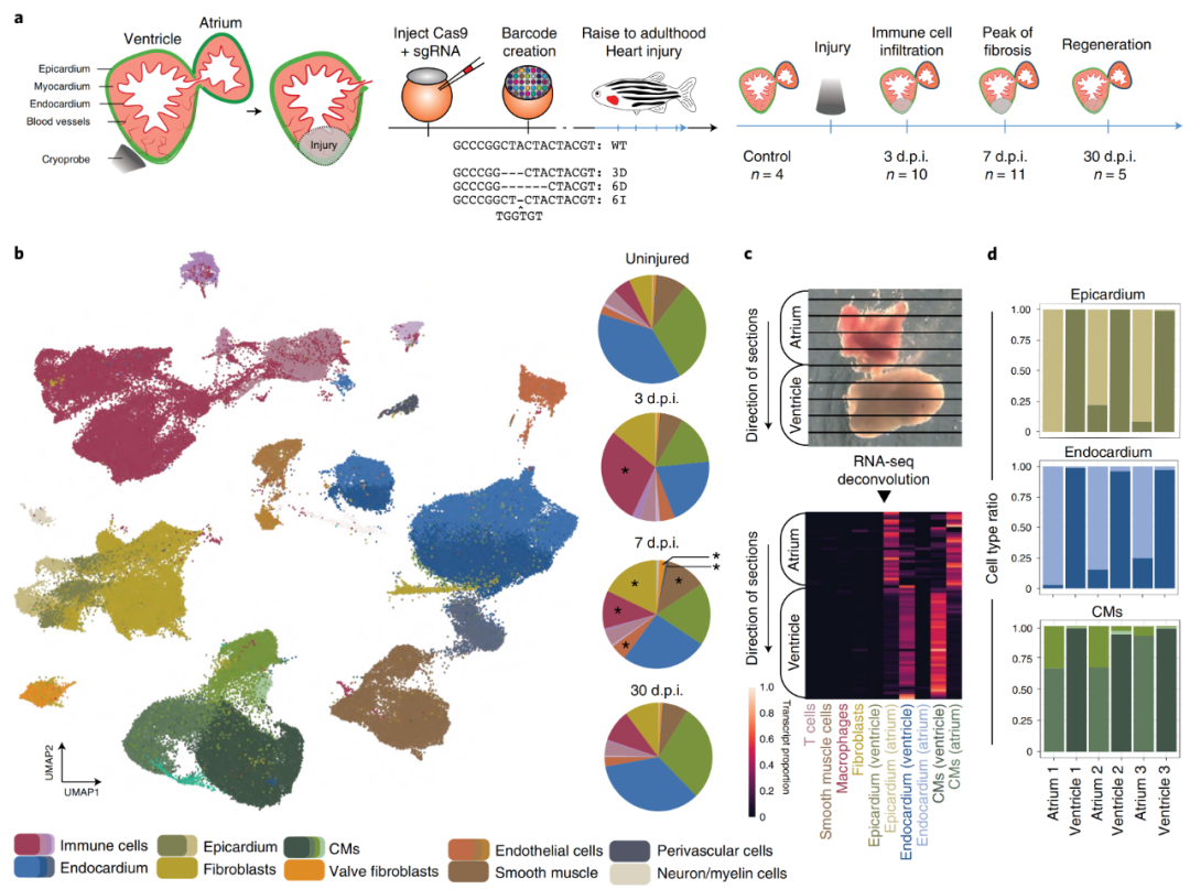 為了系統(tǒng)地識(shí)別健康和再生斑馬魚(yú)心臟中的細(xì)胞類(lèi)型,作者對(duì)損傷前后不同階段的大約20萬(wàn)個(gè)解離細(xì)胞進(jìn)行了scRNA-seq(圖1a)。為了準(zhǔn)確得到細(xì)胞發(fā)育起源的相關(guān)信息,作者還應(yīng)用了一種基于CRISPR–Cas9技術(shù)的大規(guī)模平行譜系追蹤方法,通過(guò)注射Cas9和針對(duì)多拷貝轉(zhuǎn)基因(斑馬魚(yú)系中的dTomato:一種用于斑馬魚(yú)細(xì)胞追蹤和譜系分析的多光譜細(xì)胞標(biāo)記)的sgRNA,創(chuàng)建了作為譜系條形碼的“遺傳疤痕”來(lái)記錄早期發(fā)育中的譜系關(guān)系。